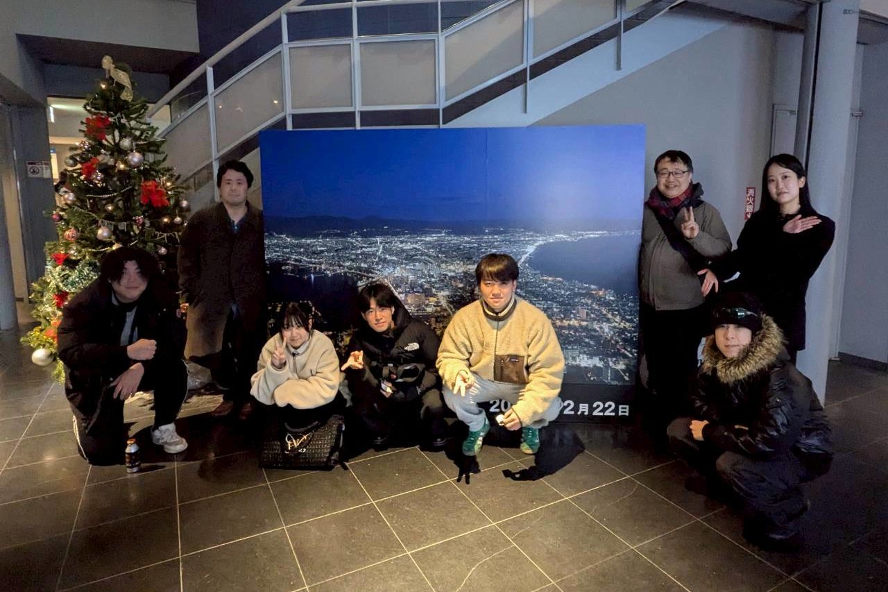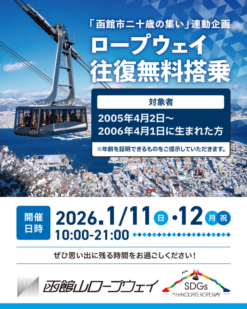 こんにちは!函館市二十歳の集い祝賀行事実行委員会です。 先日、函館ロープウェイさんを訪問し、みんなで函館山に登ってきました! 函館山ロープウェイさん協力のもと、二十歳の集い当日(1月11日)と成人の日(1月12日)は、2005年4月2日~2006年4月1日に生まれた方が無料でロープウェイに乗車できますので、皆さんもぜひ、函館山に足を運んでください! ※年齢を証明できるものを必ずご持参ください。 FacebookXBlueskyCopy